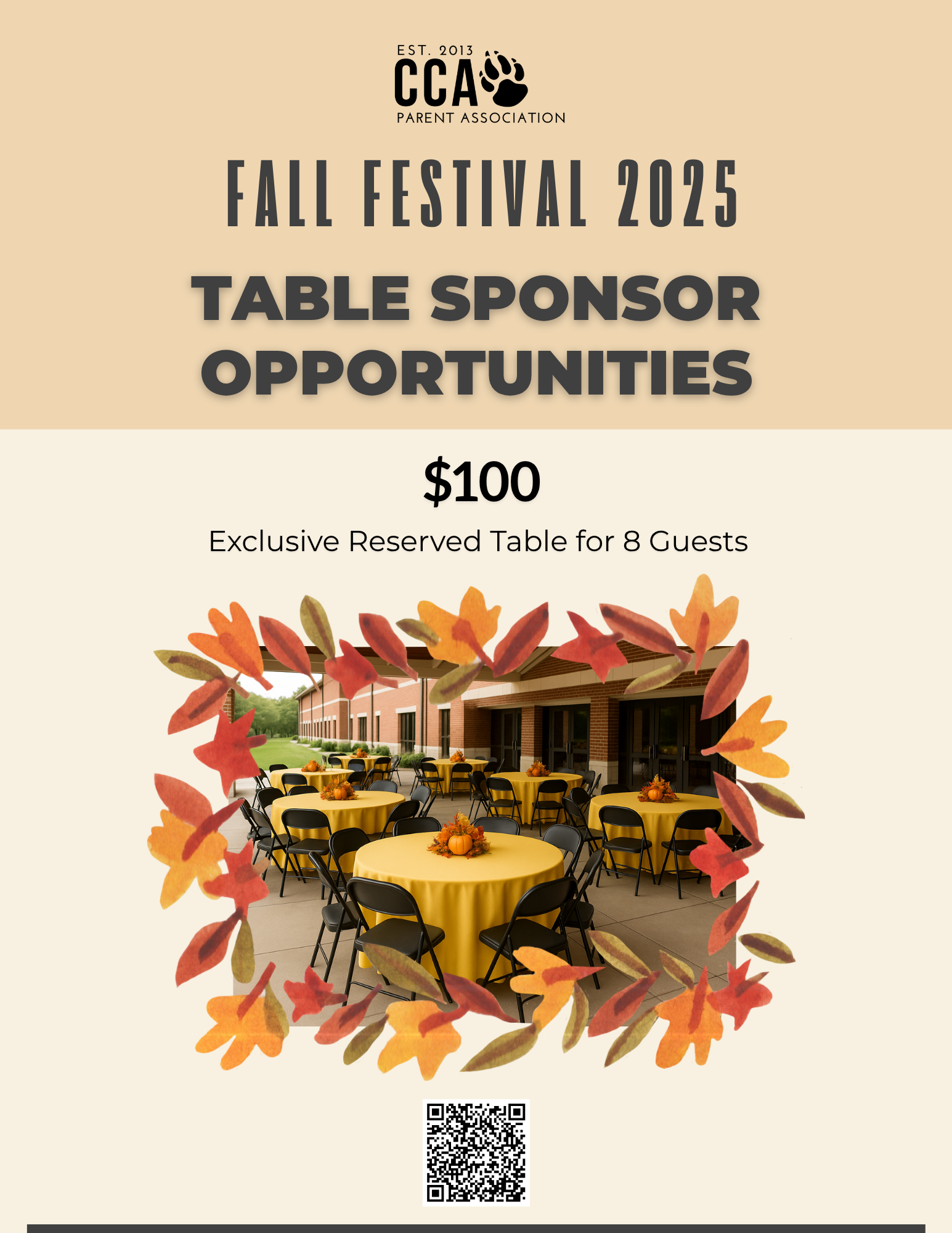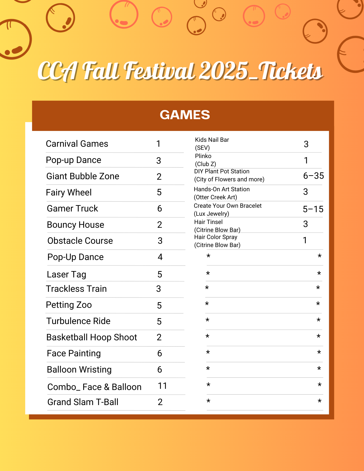 2025 CCA Fall Festival - November 8th (4-7pm) 🎟️ Purchase Tickets | 🌟 Become a Sponsor or Vendor | 🎁 Enter the Raffle & More Below! 👇 2025 Fall Festival - November 8th (4-7pm) Tickets from $10.00 Raffle Tickets $10.00 T-shirts (Toddler, Youth, Adult sizes) $20.00 Sponsorship Opportunities from $100.00 Vendor Market Booth from $40.00